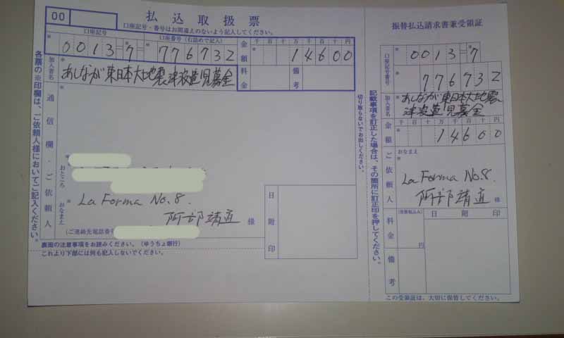 今回の売上金より、「あしなが育英金(東日本大地震津波遺児募金)」へ14600円を寄付させていただきました。